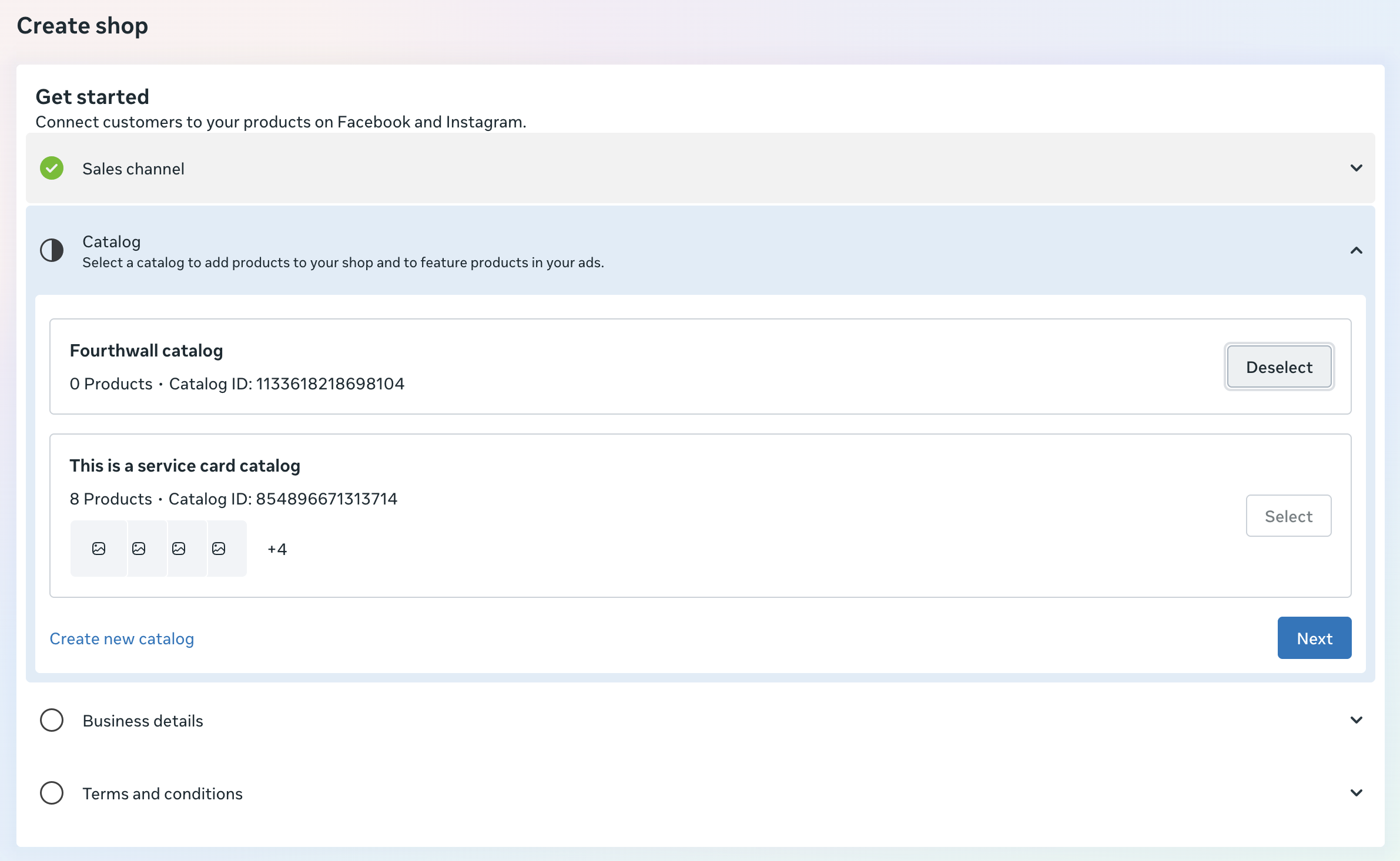 - Check that you created a shop in Facebook's Commerce Manager and not just a catalog. Facebook lets you create a catalog without a shop if all you are looking to do is ads. However, for a proper Facebook shop setup, you need to have a shop with a catalog in your Facebook Commerce Manager. If this was the case, you need to disconnect your Fourthwall shop and start from step 1.