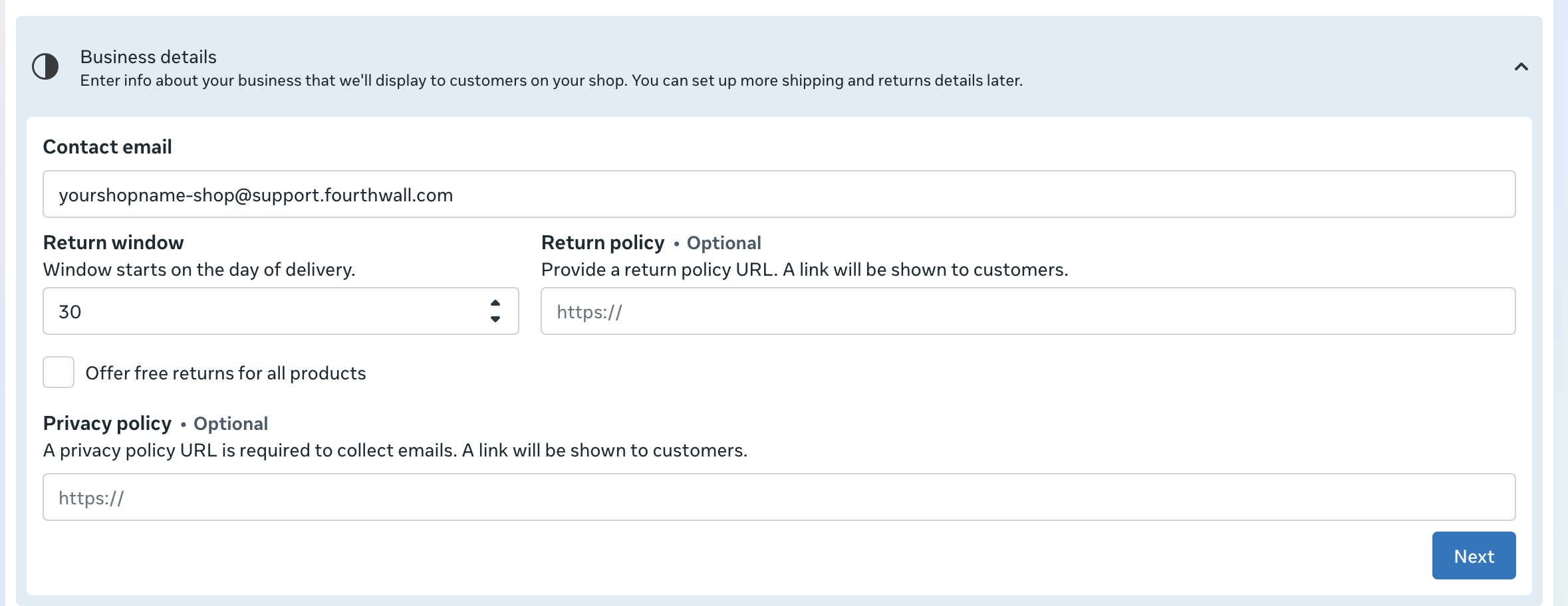 7. The next step will be to add the business details. Here, you can add your shop's customer support email address. This email will be visible to all your supporters. Once you have confirmed the email added here, if you used your shop's support email, our system will automatically forward the email with the code to your shop's super admin email. This usually takes 5-10 minutes. If you do not receive it, please contact our support team.