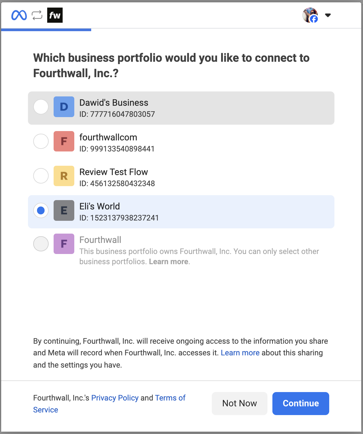 11. A new tab will open, and you will be taken to Facebook Commerce Manager, where you can select which business portfolio you want to connect to your Fourthwall shop. Select the correct one and click "Continue" to proceed.
