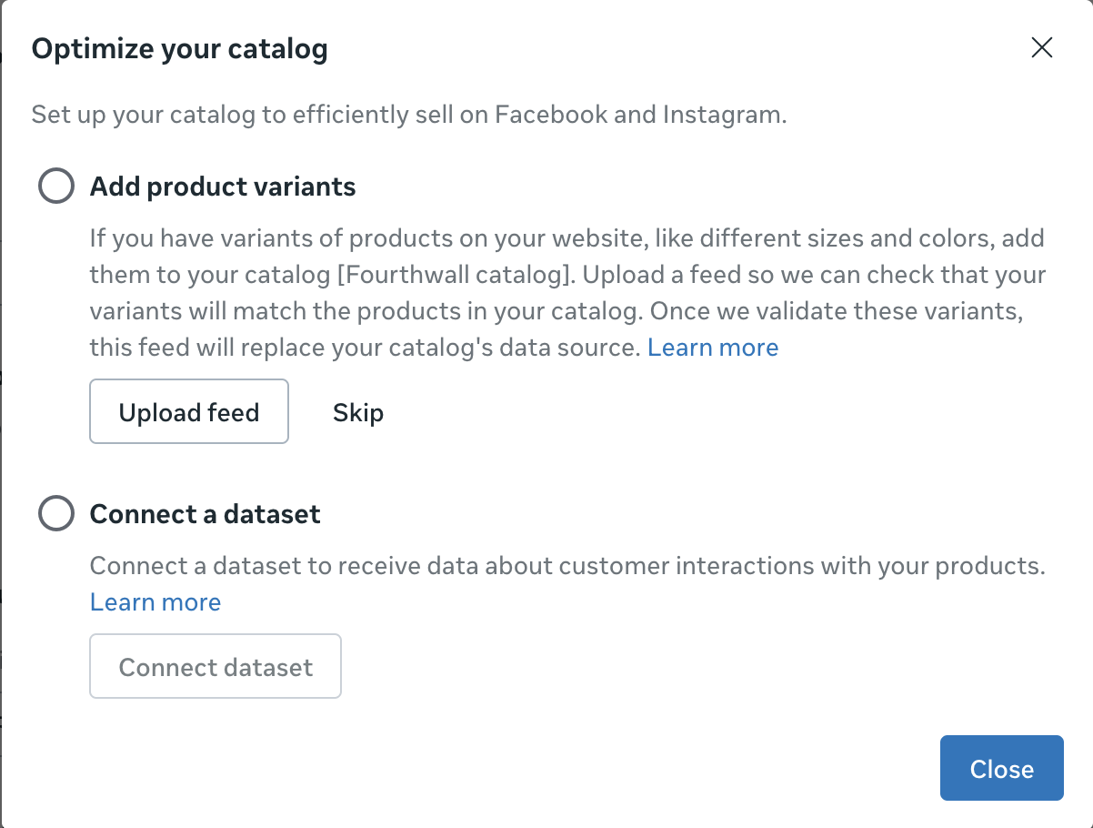 25. A window will open showing the Optimize your catalog options. Here you want to click "Skip" under the add product variants section and then "Close" to proceed back to the Overview page.