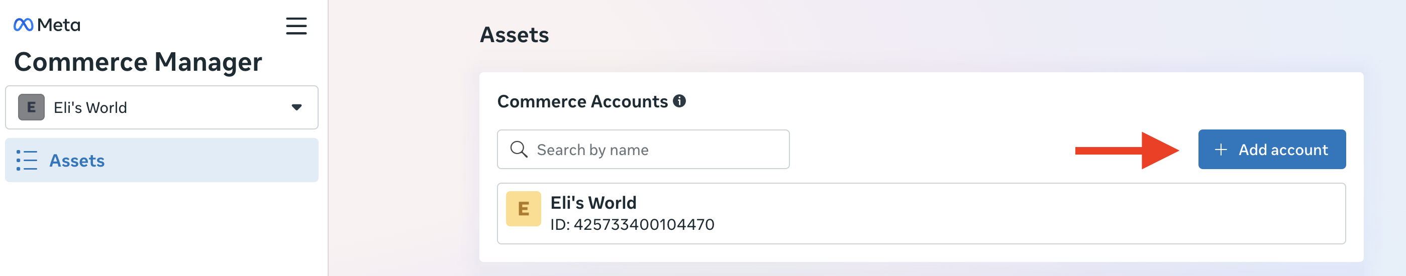 2. Within Facebook's Commerce Manager, click on "Add account" as shown in the image below