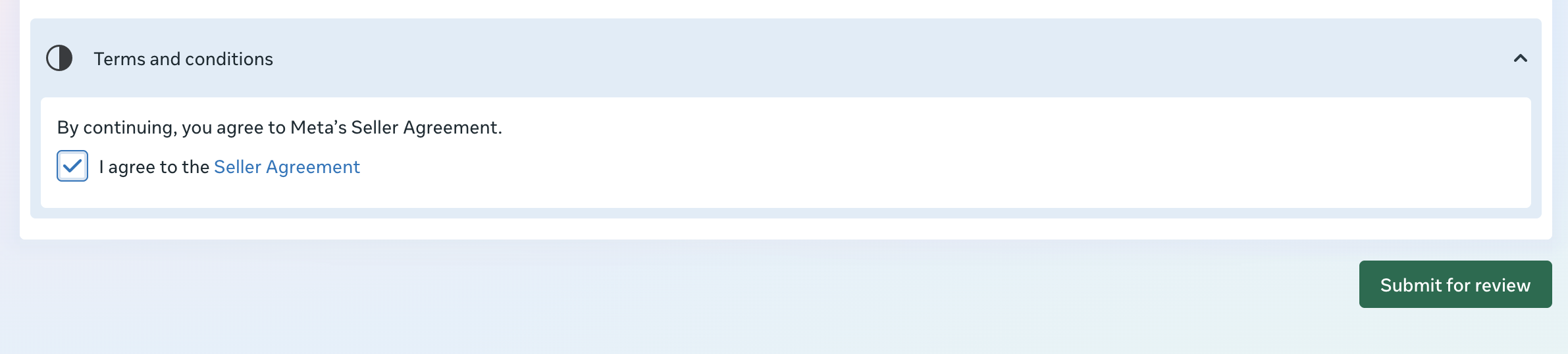 8. Finally, agree to Meta's seller agreement terms and conditions and click submit for review.
