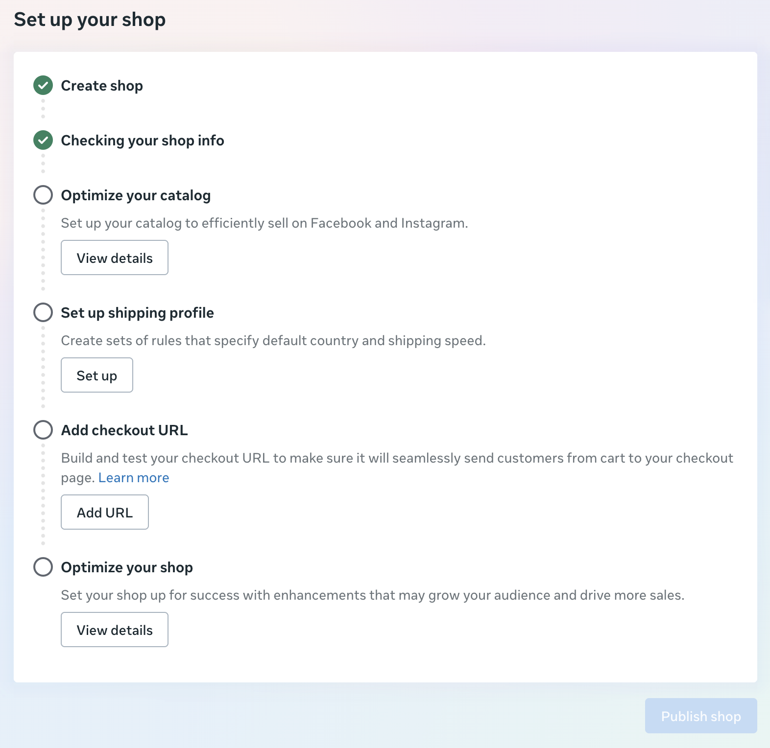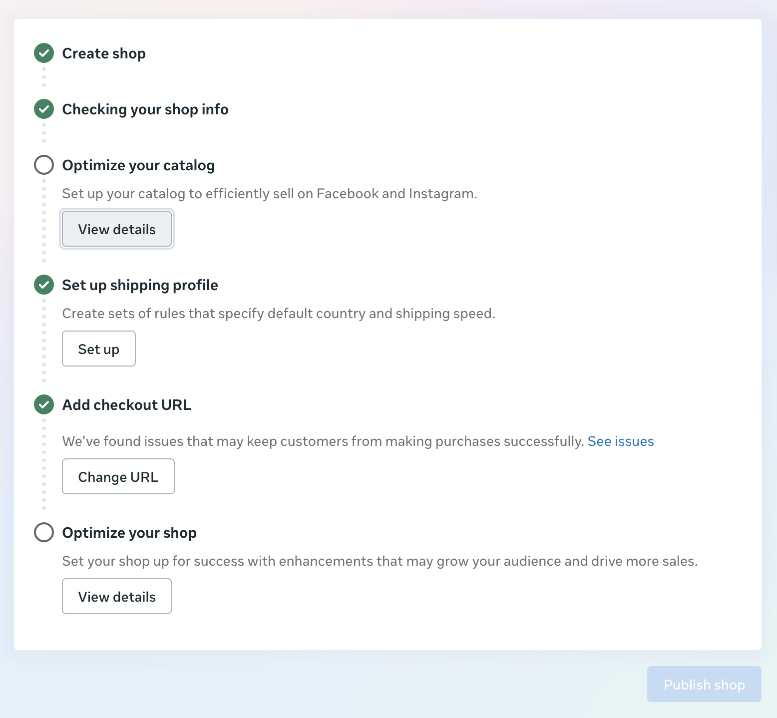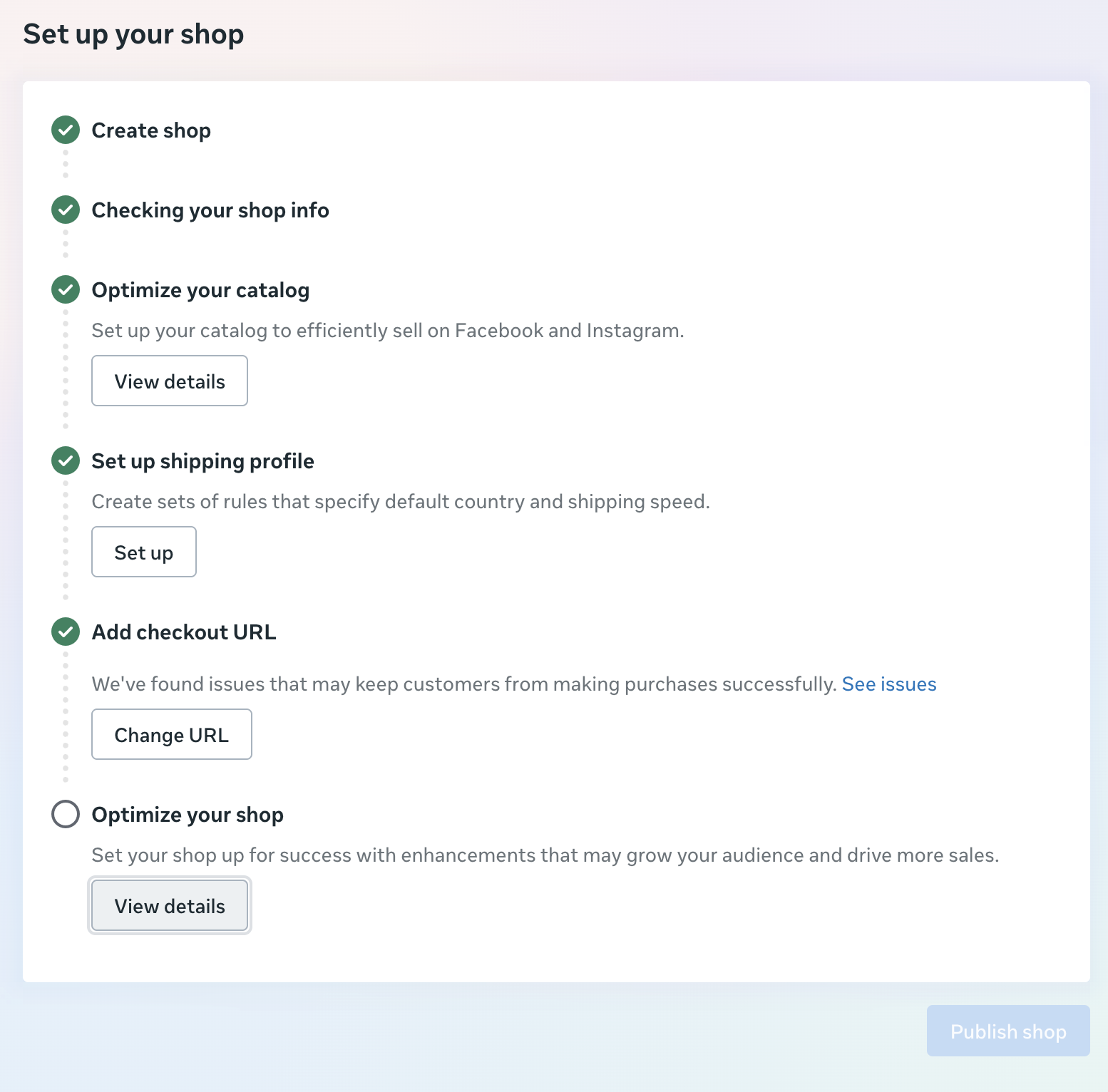 20. This will take you back to the Overview page, showing the various other steps needed to set up your shop with Meta.