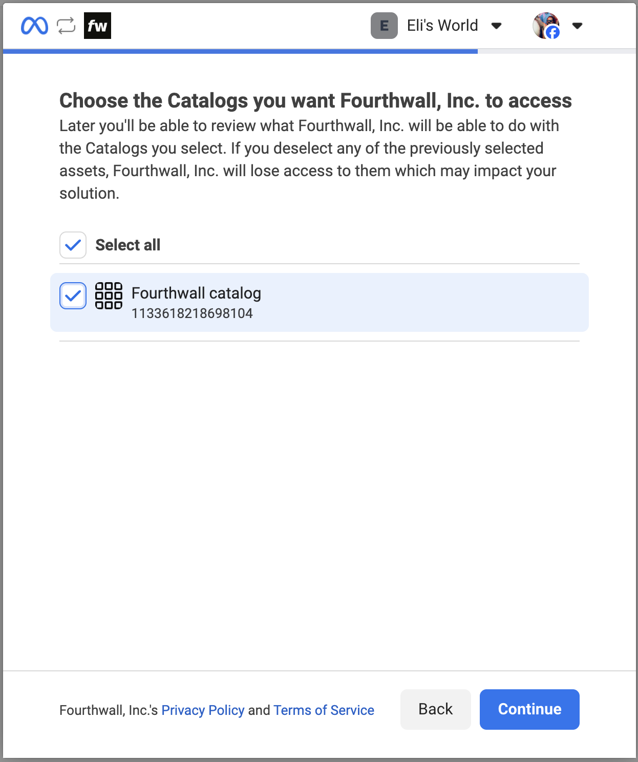 12. Select the Catalog you want to access Fourthwall to access and then click Continue to proceed.