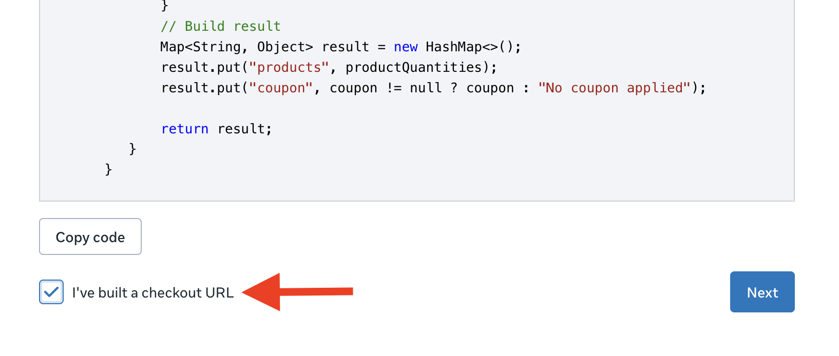 Then scroll to the bottom and check the box where it says "I've built a checkout URL" and then click next.