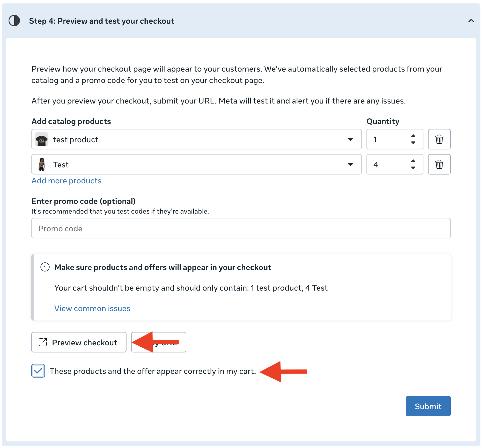 Click Preview checkout, confirm that a checkout with the proper test items was created, and then check the box next to "These products and the offer appear correctly in my cart". Click Submit to proceed.