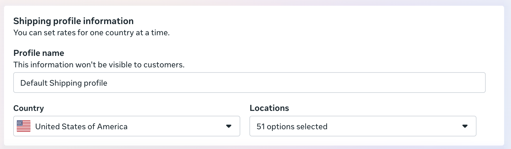 21. Next, let's set up a shipping profile. Locate the section on the overview page and click "Set up". In the first few fields, enter the name "Default shipping profile", select "USA" as the country, and select all 51 options under the "Locations" dropdown field.