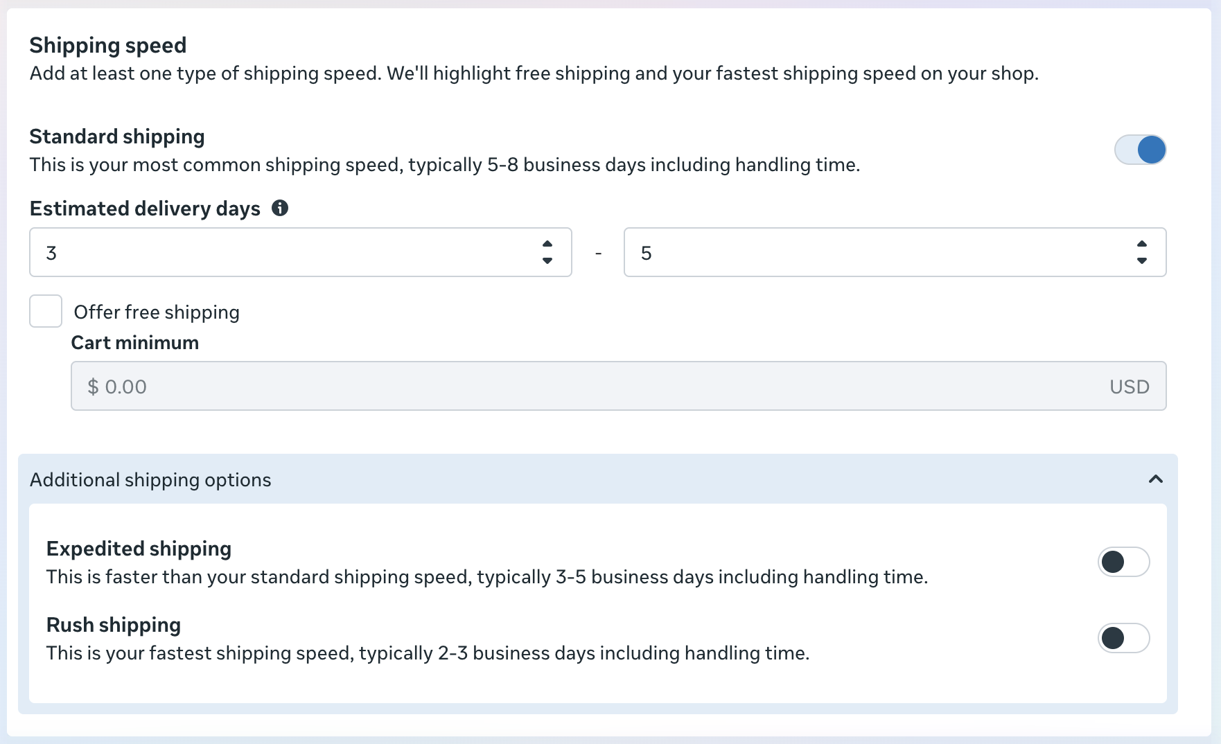 22. The next couple of fields are about setting up shipping speed. Under the standard shipping, enter 3-5 for the estimated delivery days. Leave the other shipping options turned off (they will still be visible during the checkout for your supporters, if the option is available for those items/shipping address)