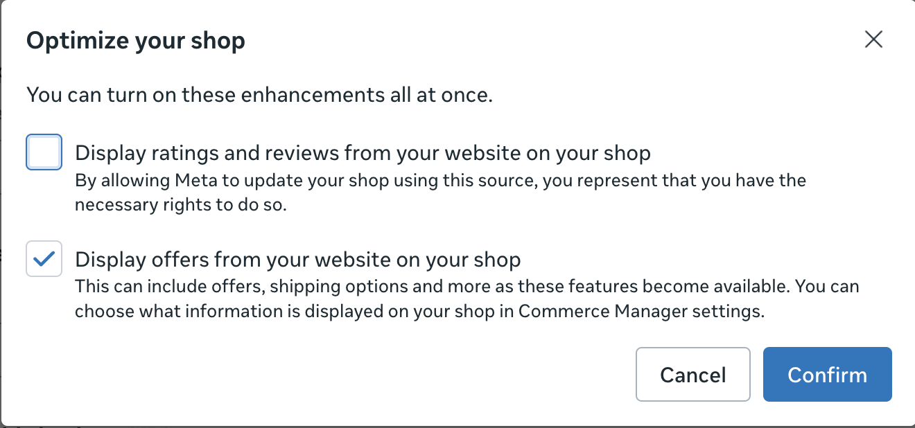 27. A window will open showing the Optimize your shop options. Here you can click if you want to display ratings/reviews on your shop, and if you want to display offers from your site in your shop. Click to turn on the display offers option, and then click "Confirm" to return to the Overview page.