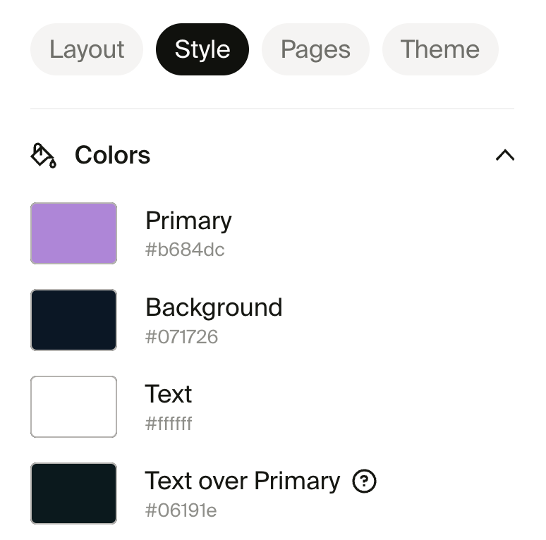 To adjust your site’s colors, go to Site Design > Style > Colors. You can change four main elements: