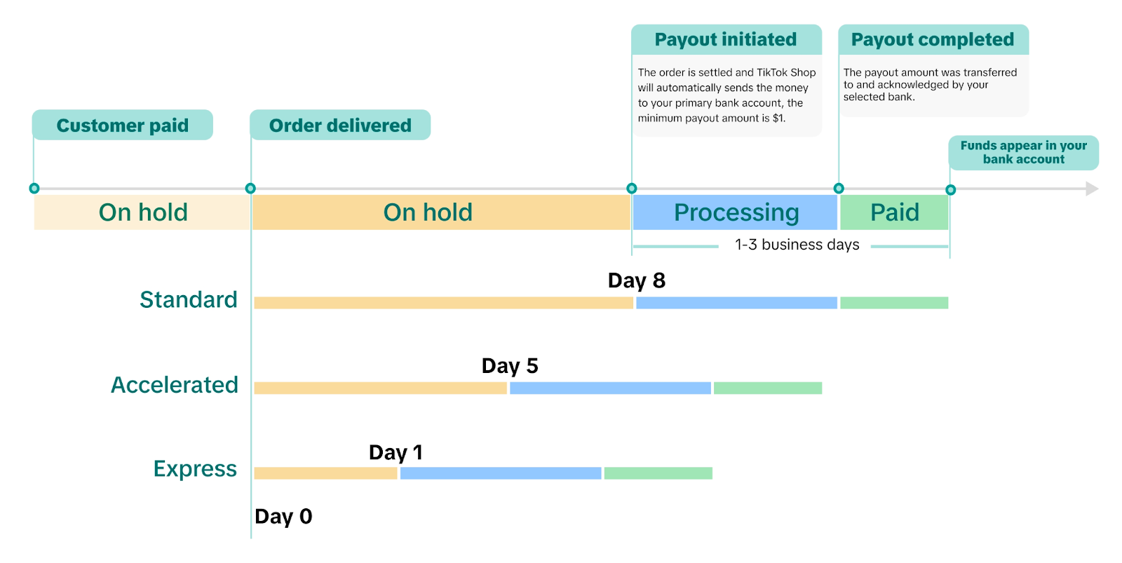 TikTok has what they call settlement period rules on when you get paid for each order. You can read more on TikTok Finance FAQs, but the basic is TikTok Shop will settle the order revenue (net of TikTok fees) within 1 to 8 calendar days after the order is delivered to your supporter. Once you have a good amount of orders to establish a good shipping track record, you can apply for accelerated processing with TikTok to get paid faster. You can see the payment timeline below.