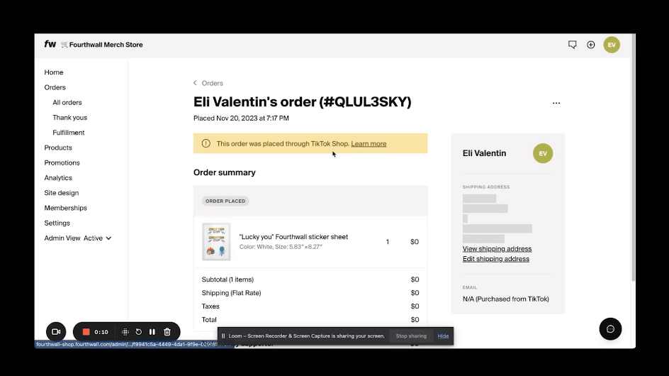 Let’s start with the important one! Orders made on TikTok are processed by TikTok, and all payment details and revenue live in your TikTok Business Account. TikTok does not share this information with Fourthwall and only lets us know the details for sending orders for production and fulfillment. This takes us to the next question: