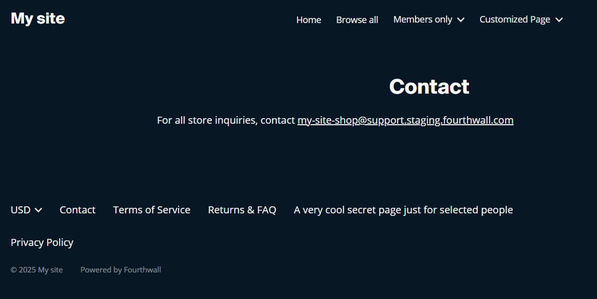 Every shop gets its own unique support email. You can find it on your contact page by adding /pages/contact to your shop URL. All inquiries sent to this email are routed through Fourthwall’s support team.