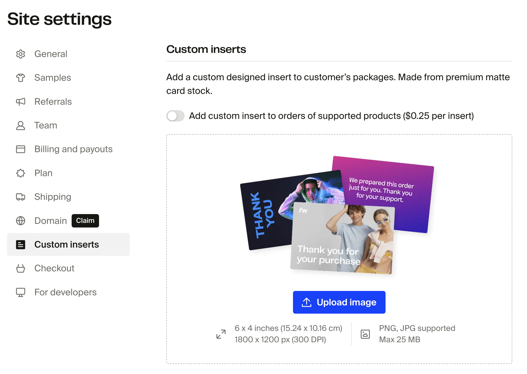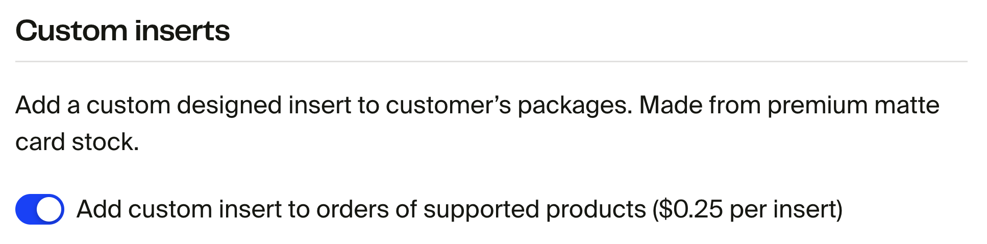 You can add custom inserts to your on-demand product orders to give every shipment a more personal and premium touch. Inserts are printed on-demand on premium matte card stock and can be used for a variety of purposes, such as thank-you notes, personal messages, or branded cards.