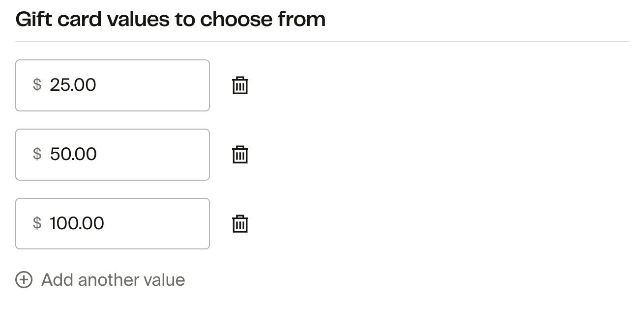 Next, select the gift card values you want to offer. You can decide to sell the same value per gift card listing, i.e. $50, or you can have multiple options of values for the supporters to select from, i.e. $25, $50, $100 value gift cards. To add additional value options, just click on "add another value."